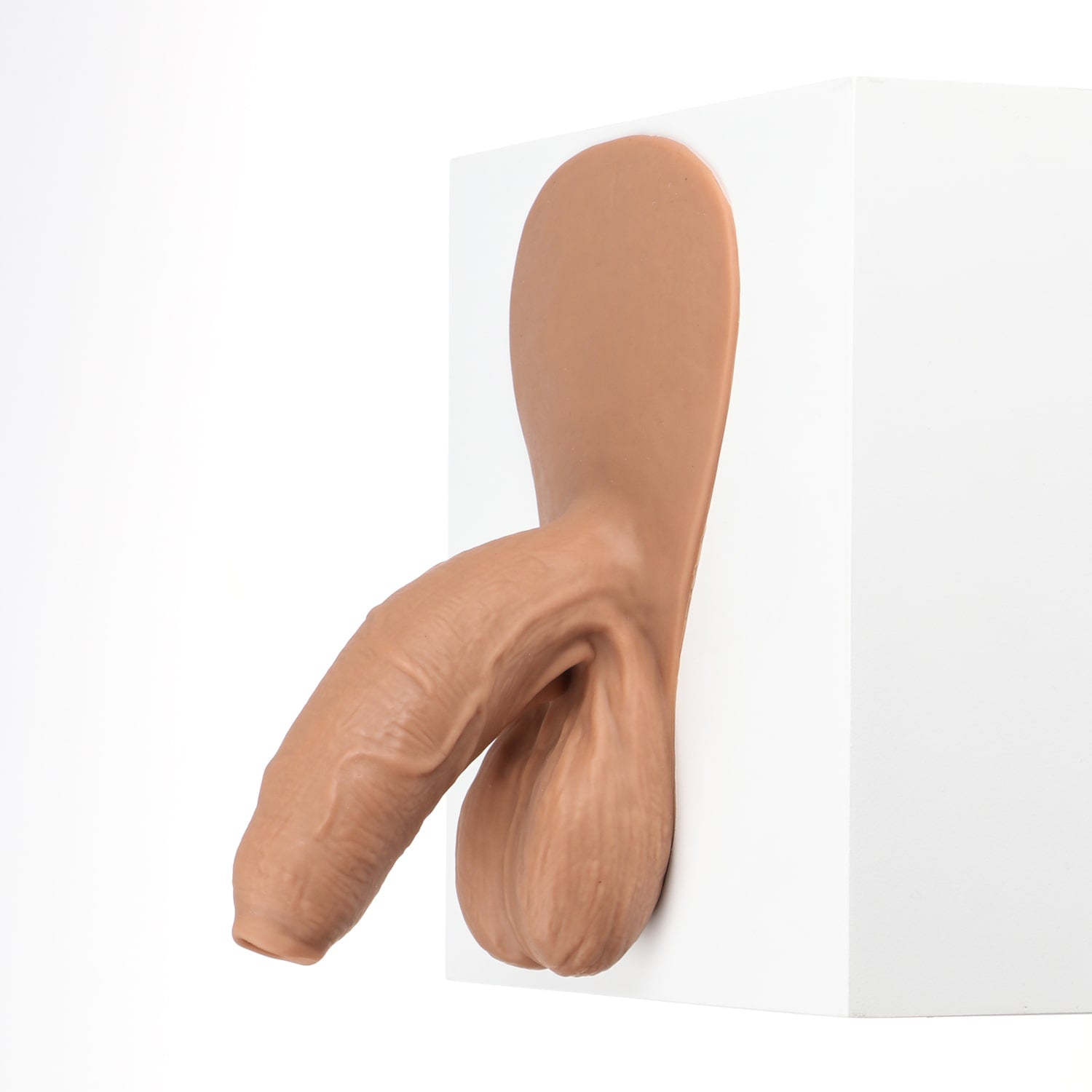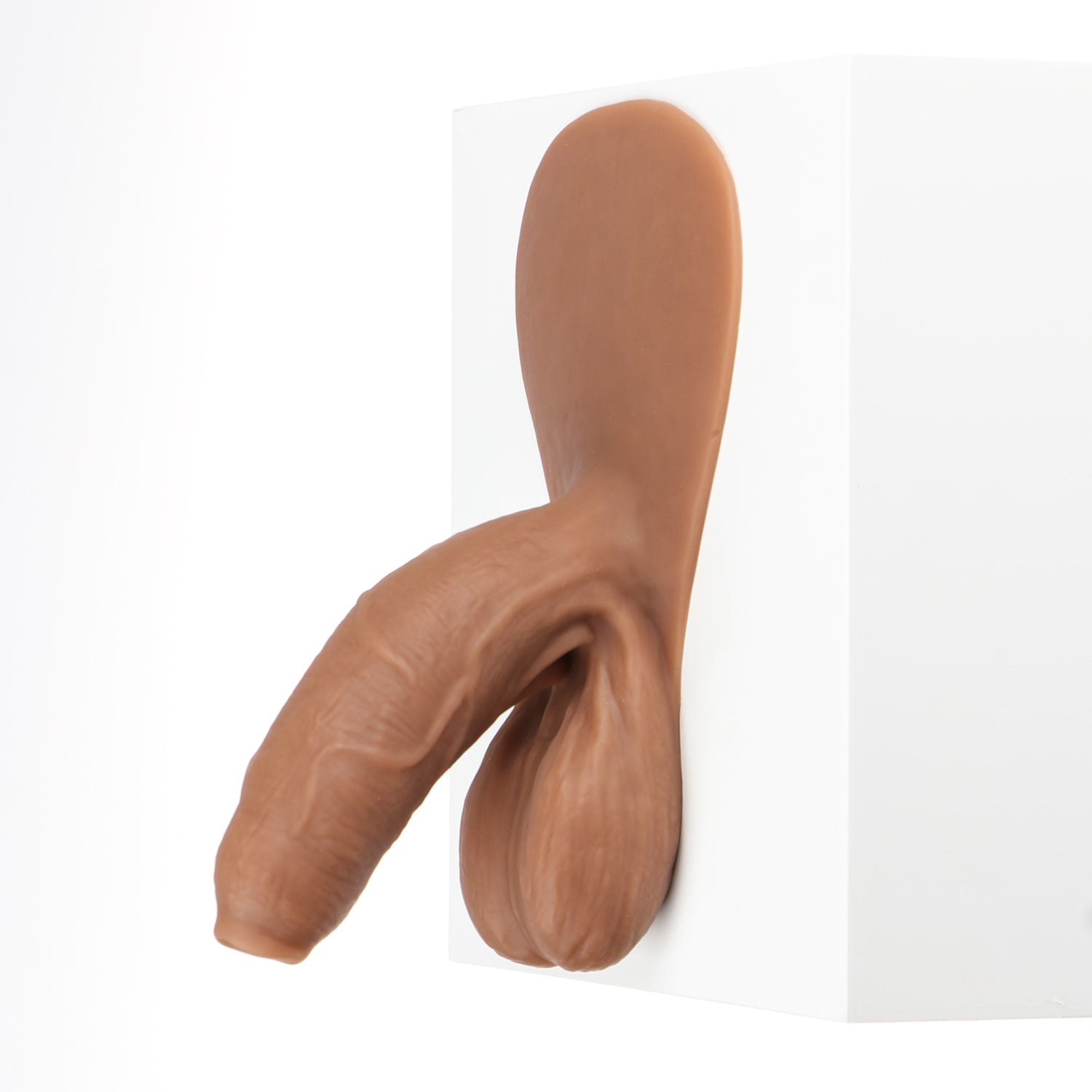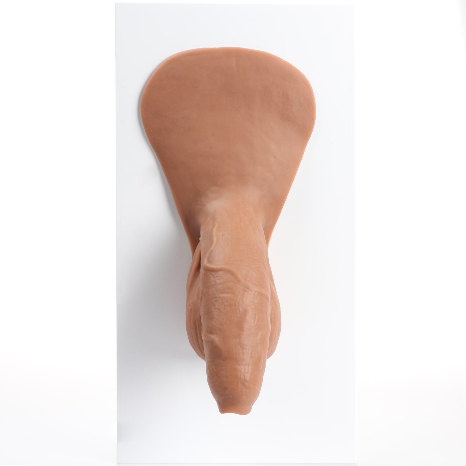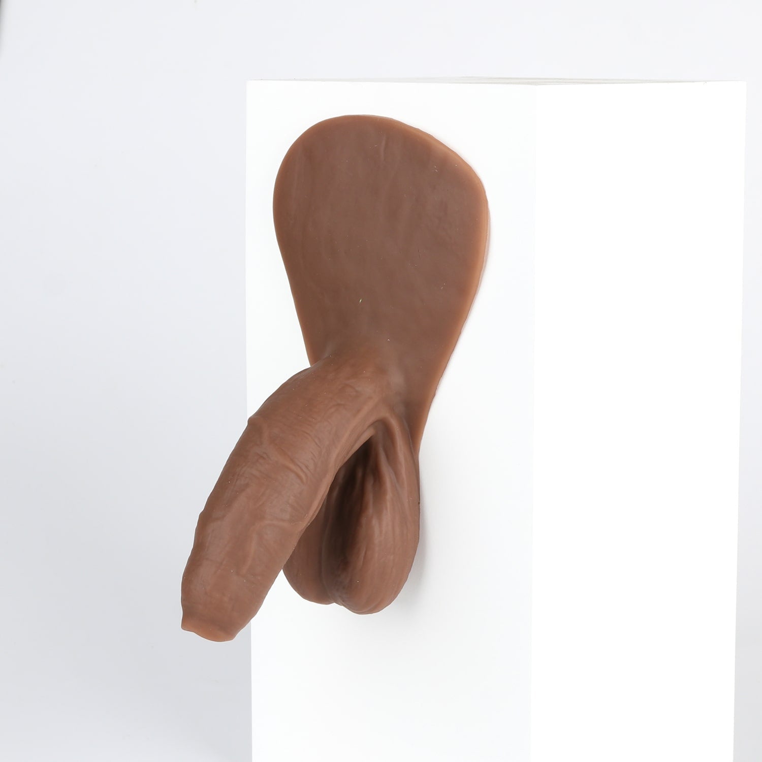 Monsieur Wiggle is an uncircumcised and naturally bent packer with detailed veins and folds. It has a soft texture, a long and girthy shaft as well as elongated balls. This product also has a tab that may be affixed to the body using self-adhesive sheets*. This will provide you with a feeling of natural movement from our prosthetic. If you do not wish to purchase self-adhesive sheets, you can always tuck the tab under the elastic band of your underwear.