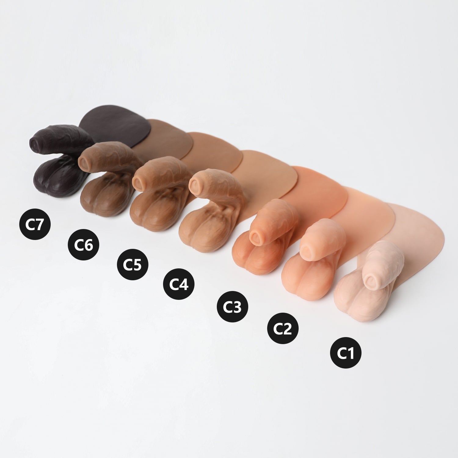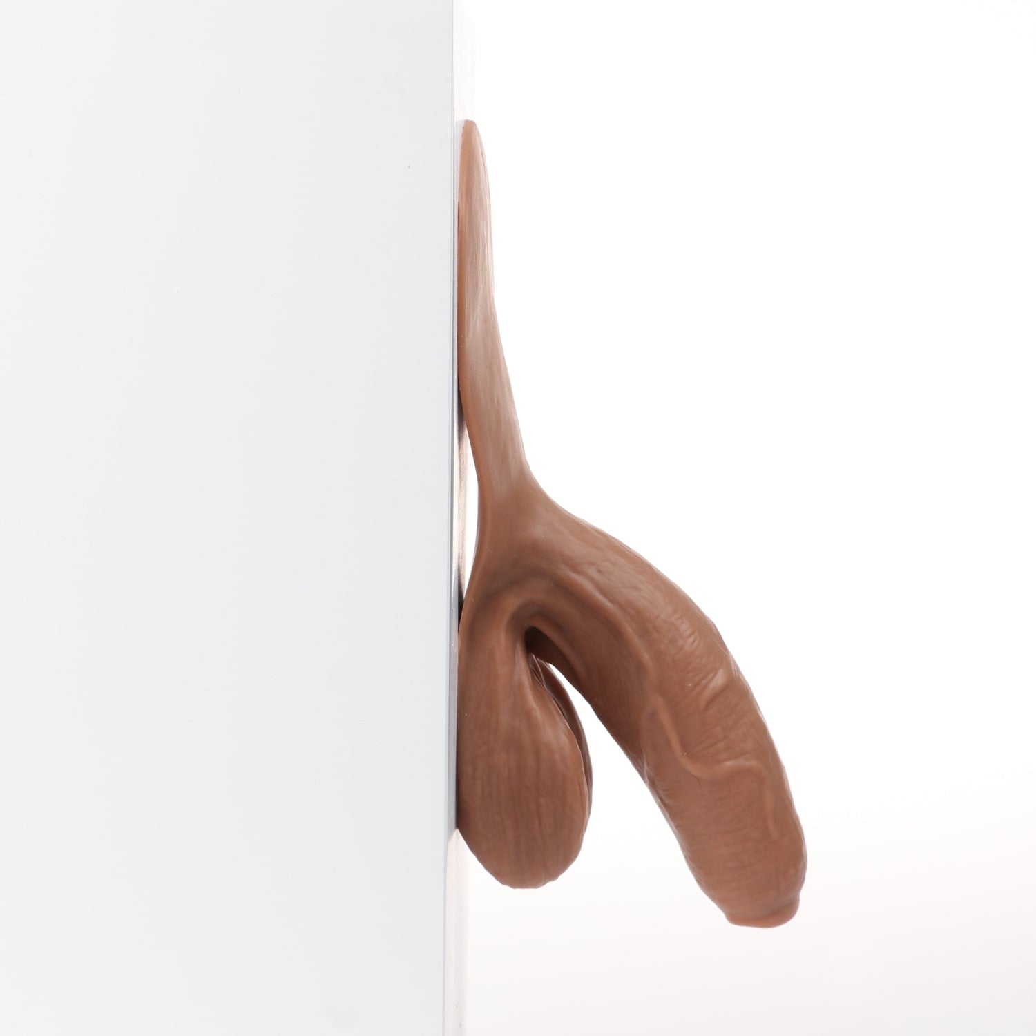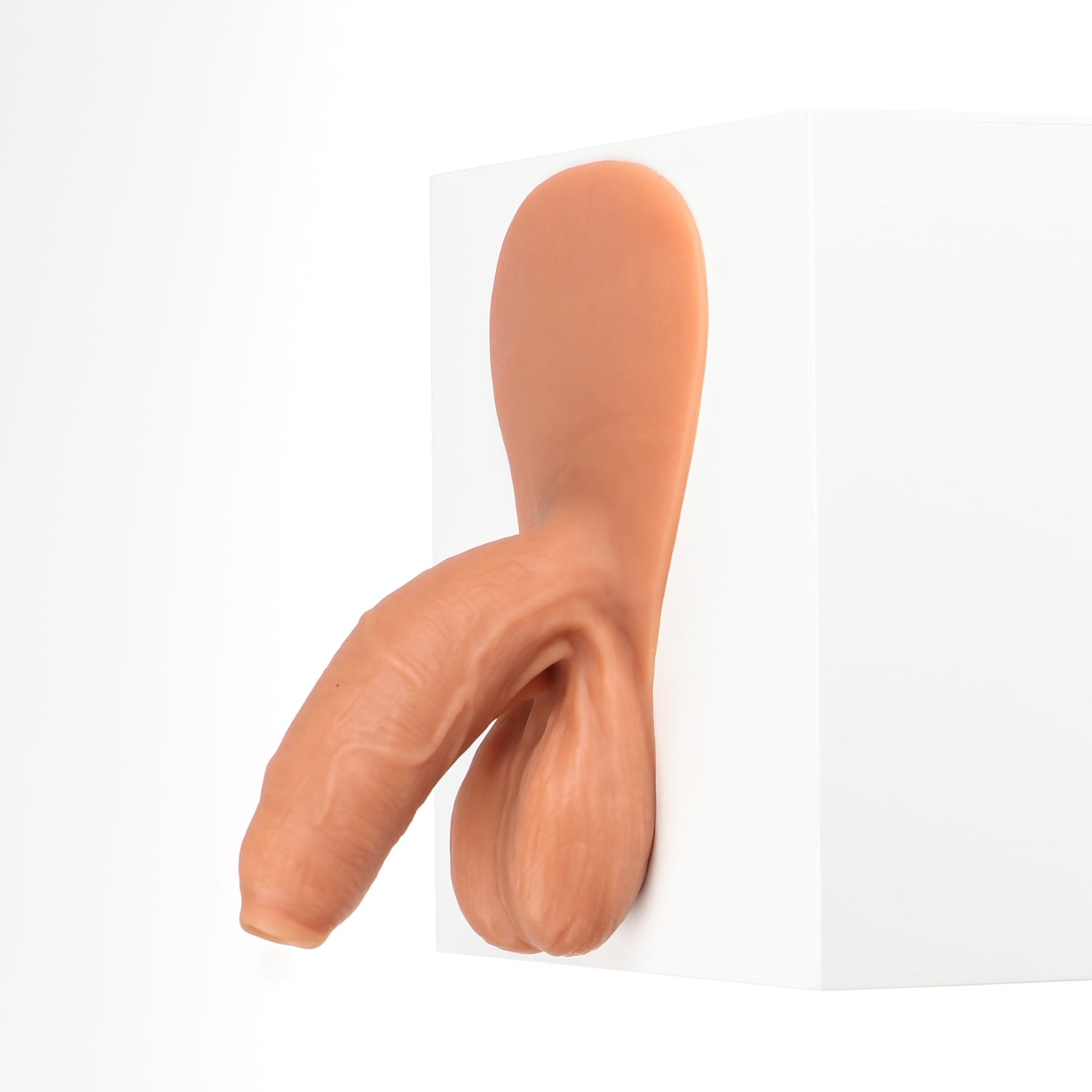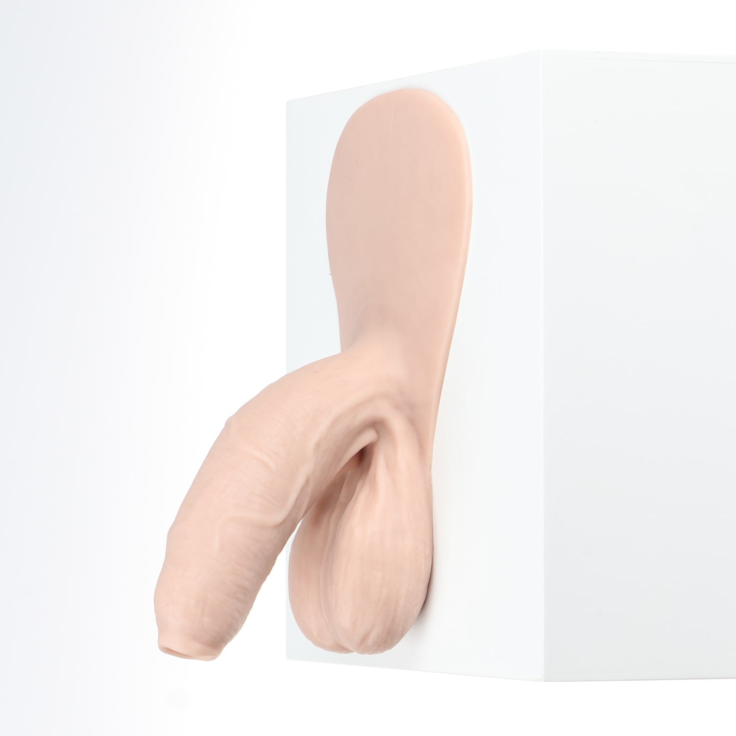 Monsieur Wiggle is an uncircumcised and naturally bent packer with detailed veins and folds. It has a soft texture, a long and girthy shaft as well as elongated balls. This product also has a tab that may be affixed to the body using self-adhesive sheets*. This will provide you with a feeling of natural movement from our prosthetic. If you do not wish to purchase self-adhesive sheets, you can always tuck the tab under the elastic band of your underwear.